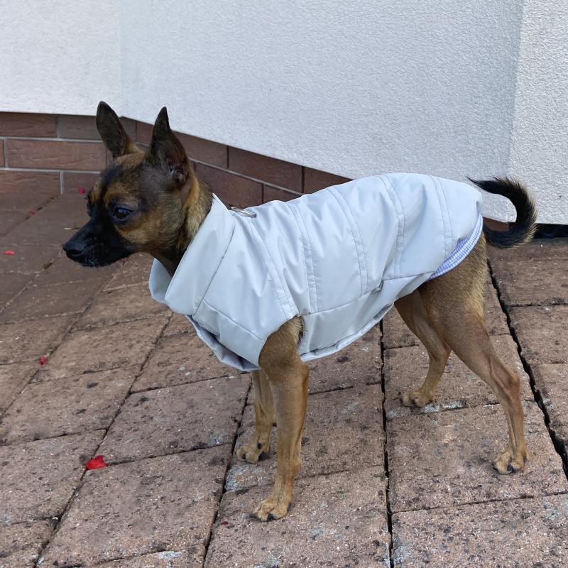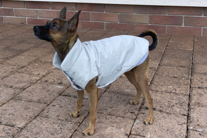 Obleček je ušitý ze třech vrstev materiálů. Vrchní materiál je nepromokavá šusťákovina s TPU zátěrem. Prostřední vrstva je tenší oděvní vatelín, a spodní vrstvu tvoří hladká saténová podšívka. Díky ní na oblečku neulpívají žádné chlupy a je vhodný i pro jorkšírky s delším vlasem.
