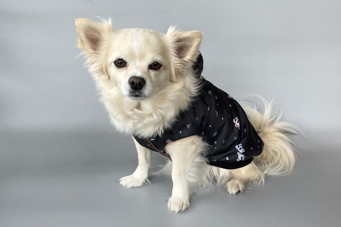 Vrchní vrstva oblečku tvoří matná šusťákovina s TPU zátěrem, vhodná do deště, podšitá teplákovým úpletem, který zahřeje Vašeho pejska. Kapuce není odepínací. Je k oblečku připevněna suchým zipem, proto nepřepadá při chůzi pejskovi přes hlavu. Obleček má pod kapucí našité očko, za které můžete připnout vodítko. V zadní délce je našitý pružný náplet, který obepíná tělíčko pejska. Zapínání na bříšku pomocí suchého zipu umožňuje regulovat velikost o 1- 2 cm. Obleček je opatřen reflexním prvkem pro zvýšení bezpečnosti pejska za šera.