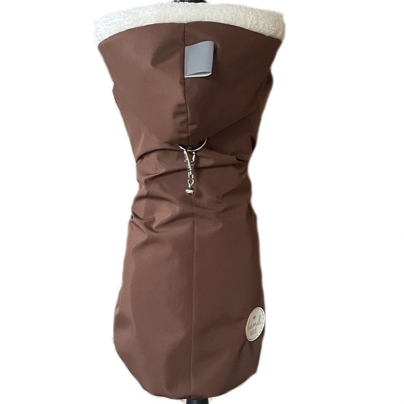 Stylová celoroční bunda pro psy ve skořicové barvě. Šitá na míru, z BIO bavlny, voděodolná a pohodlná. Ideální obleček pro čivavy a malé pejsky. celý popis