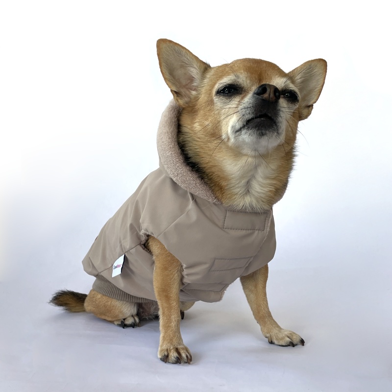 Stylová celoroční bunda pro psy ve skořicové barvě. Šitá na míru, z BIO bavlny, voděodolná a pohodlná. Ideální obleček pro čivavy a malé pejsky. celý popis