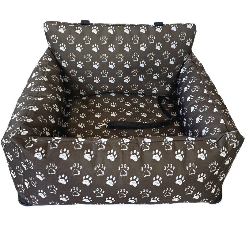 Stylový a praktický cestovní pelíšek pro malé pejsky, který kombinuje pohodlí domova s bezpečností na cestách. Vrchní i vnitřní část je ušitá z odolné hnědé kočárkoviny s potiskem tlapiček, která odpuzuje vodu i nečistoty.