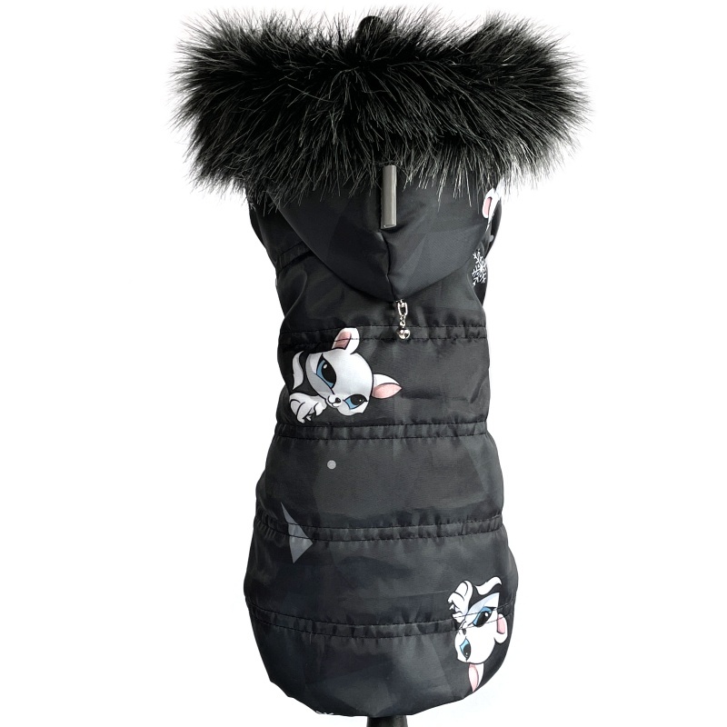 ❄️ Elegantní zimní bunda pro psa s odepínací kapucí – šitá na míru v barvě černé potisk kočky
