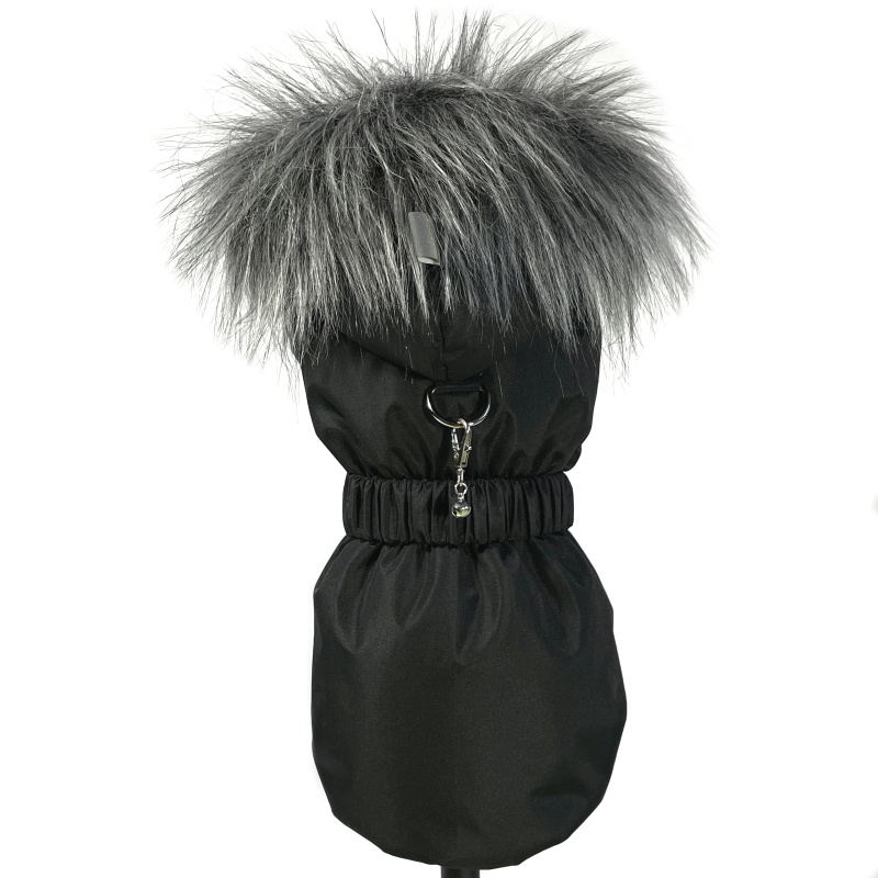 Nechybí ani odepínací kapuce, zdobená elegantní kožešinou s dlouhým chlupem, která dodává kabátku luxusní vzhled a chrání hlavičku pejska před větrem i sněhem.
