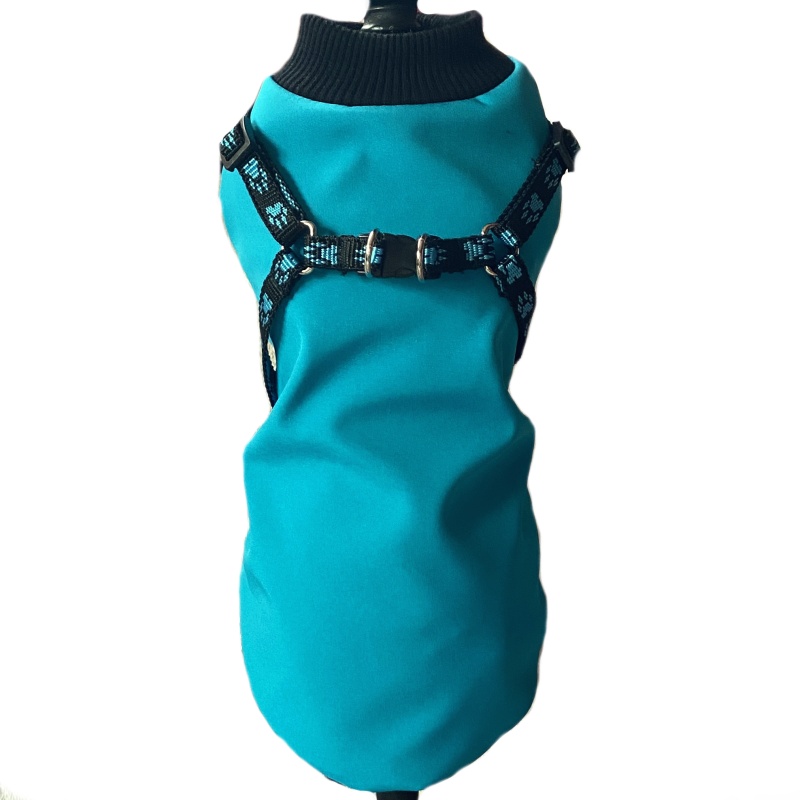 3. Funkční pláštěnka pro psa zimní softshell tyrkys s kšírami