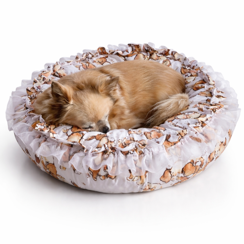 Kulatý bavlněný pelíšek pro čivavy bílý s potiskem pejsků
