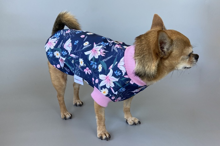 Letní softshell je funkční materiál, který zajišťuje voděodolnost a ochranu proti větru. Materiál není zcela voděodolný jako pláštěnka, ale menší deštíky zvládne s přehledem. Látka je měkká, jemná a paropropustná, rubová vrstva je z tenké síťoviny a nemá žádné zateplení. Pružné náplety kolem nožiček, krku a zadní délky zajistí dobru přilnavost oblečku k tělíčku pejska. Obleček má poutko pro připnutí vodítka.
