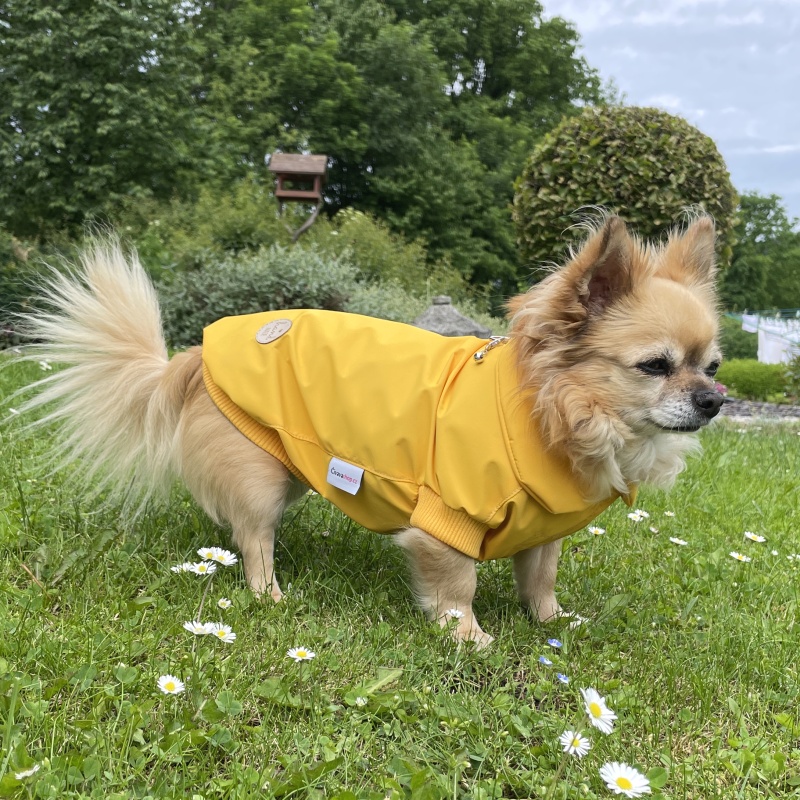 Lehká a praktická ochrana před větrem i dešťovými kapkami – tato tenká letní větrovka v elegantní žluté barvě je ideální pro jarní a letní procházky. Je ušita z jemné šusťákoviny s TPU zátěrem, která je voděodolná, větruodolná a zároveň prodyšná, takže pejsek zůstane v suchu a pohodlí i při náhlé zm... celý popis