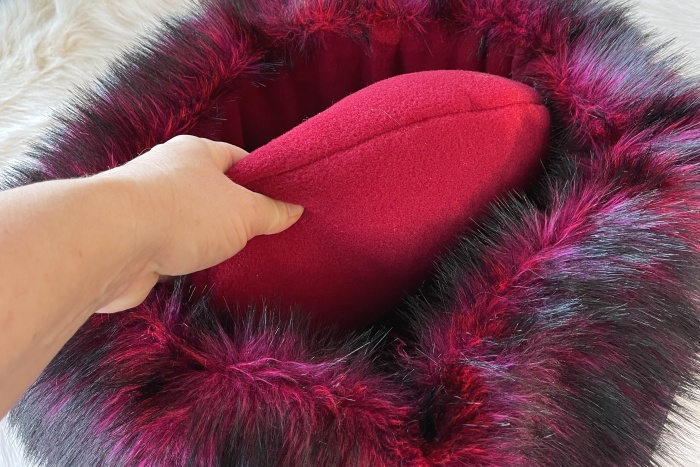 Na vnější straně jsou našité kapsy pro uložení drobných předmětů. Součástí pelíšku je také odepínací kapsička vhodná třeba na sáčky. Vnitřní průměr je 30 cm je vhodný pro malá a nejmenší plemena psů do 3,5 kg