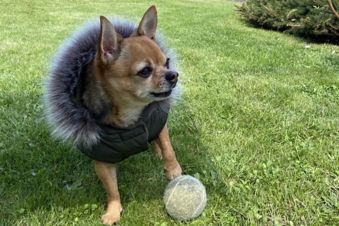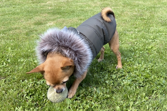 Kapuce zdobená kožešinkou je připevněna k oblečku třemi koflíky a dá se proto kdykoliv odepnout. Kožešinu se nebojte v případě potřeby vyprat, pouze ji ještě mokrou protřepejte, nebo pročesejte hřebenem. Pod kapucou je našité poutko pro připnutí vodítka. Poutko je určené k připnutí pejsků s váhou do 4 kg. Kapuce je k oblečku připevněna suchým zipem, proto drží na svém místě a při chůzi nepřepadá pejskovi přes hlavu. V zadní délce a kolem krku je našitý pružný náplet, který obepíná tělíčko pejska.