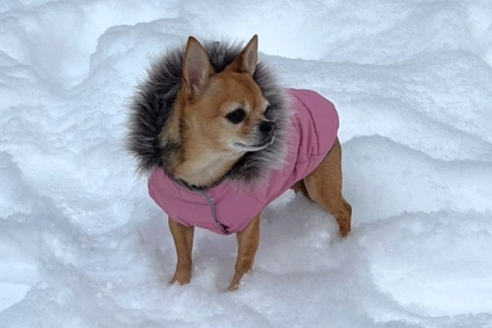 Kapuce zdobená kožešinkou je připevněna k oblečku třemi koflíky a dá se proto kdykoliv odepnout. Kožešinu se nebojte v případě potřeby vyprat, pouze ji ještě mokrou protřepejte, nebo pročesejte hřebenem. Pod kapucou je našité poutko pro připnutí vodítka. Poutko je určené k připnutí pejsků s váhou do 4 kg. Kapuce je k oblečku připevněna suchým zipem, proto drží na svém místě a při chůzi nepřepadá pejskovi přes hlavu. V zadní délce a kolem krku je našitý pružný náplet, který obepíná tělíčko pejska.