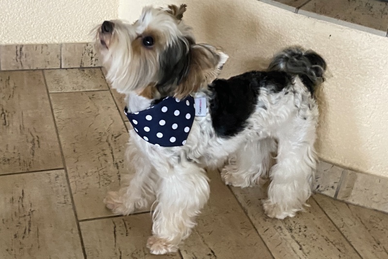 • Šátek je ideální pro malá plemena psů, přičemž je k dispozici v několika velikostech, aby perfektně seděl na vašem psu.