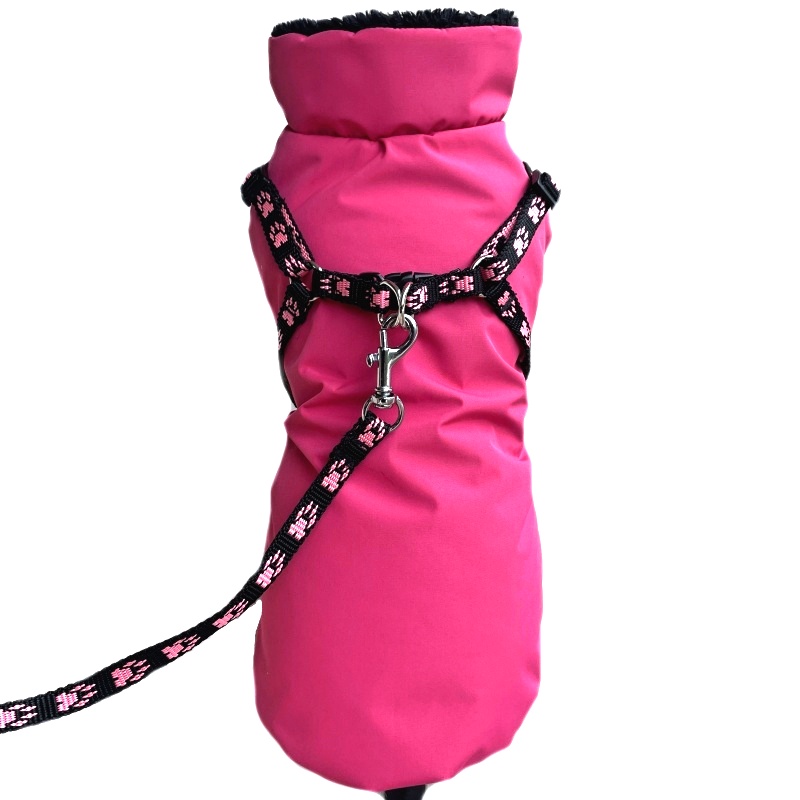 3. ❄️ Zimní kožíšek pro psa se všitými kšírami – sytě růžový