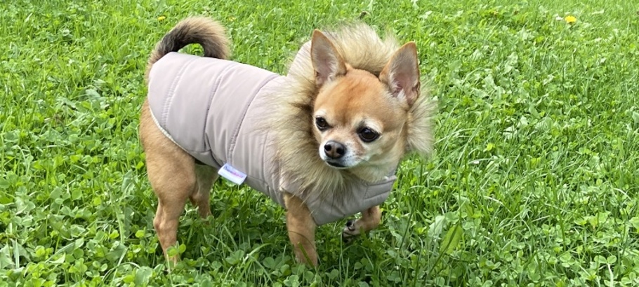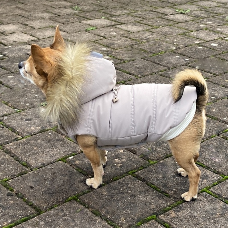 Kapuce zdobená kožešinkou je připevněna k oblečku třemi koflíky a dá se proto kdykoliv odepnout. Kožešinu se nebojte v případě potřeby vyprat, pouze ji ještě mokrou protřepejte, nebo pročesejte hřebenem. Pod kapucou je našité poutko pro připnutí vodítka. Poutko je určené k připnutí pejsků s váhou do 4 kg. Kapuce je k oblečku připevněna suchým zipem, proto drží na svém místě a při chůzi nepřepadá pejskovi přes hlavu. V zadní délce a kolem krku je našitý pružný náplet, který obepíná tělíčko pejska.