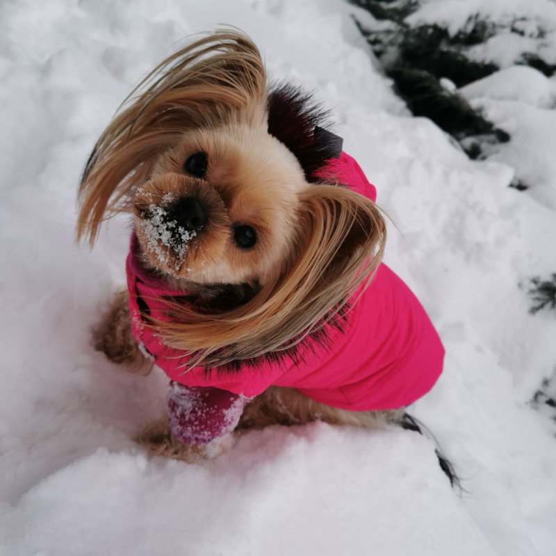 Kapuce zdobená kožešinkou je připevněna k oblečku třemi koflíky a dá se proto kdykoliv odepnout. Kožešinu se nebojte v případě potřeby vyprat, pouze ji ještě mokrou protřepejte, nebo pročesejte hřebenem. Pod kapucou je našité poutko pro připnutí vodítka. Poutko je určené k připnutí pejsků s váhou do 4 kg. Kapuce je k oblečku připevněna suchým zipem, proto drží na svém místě a při chůzi nepřepadá pejskovi přes hlavu. V zadní délce a kolem krku je našitý pružný náplet, který obepíná tělíčko pejska.